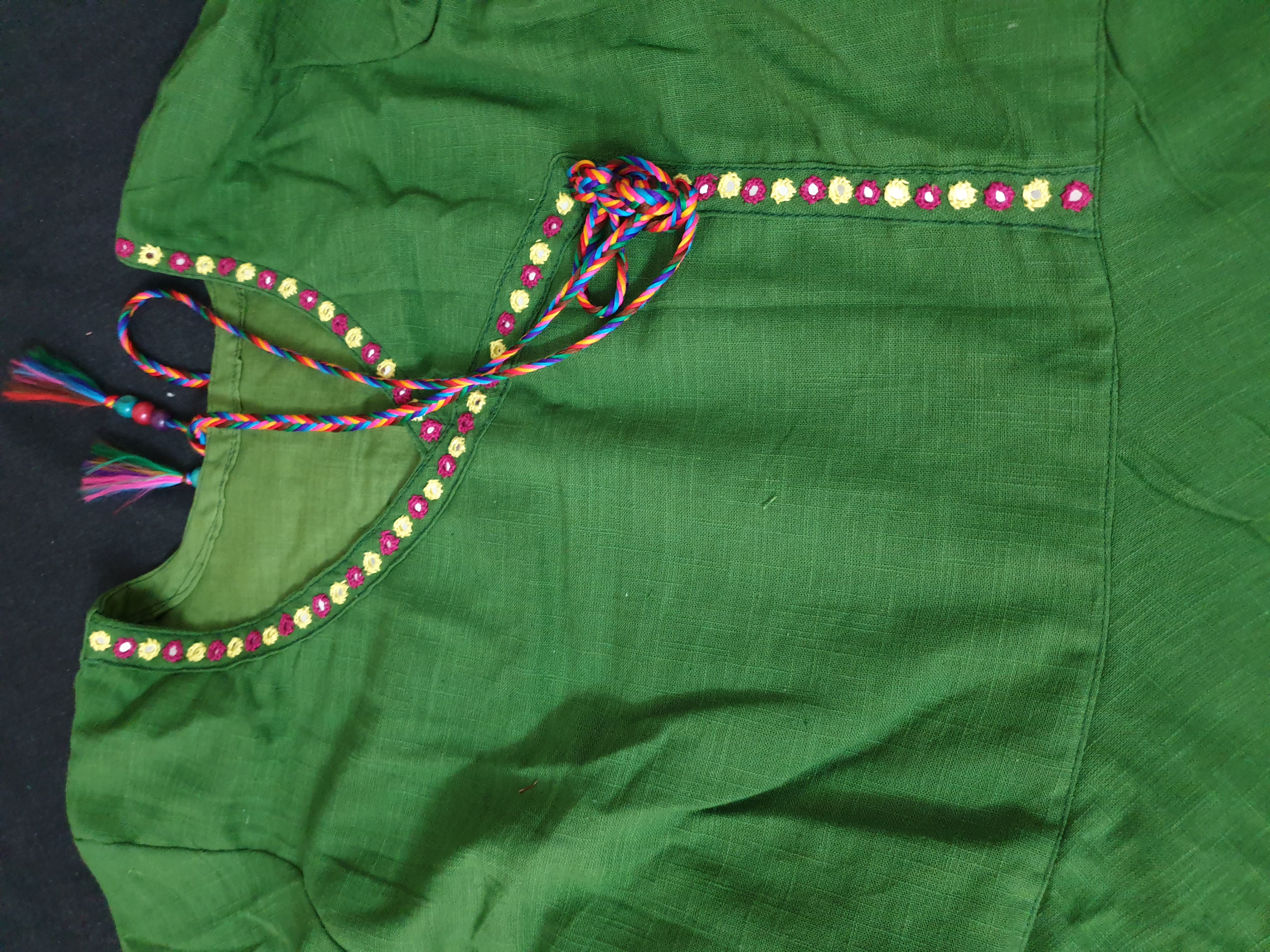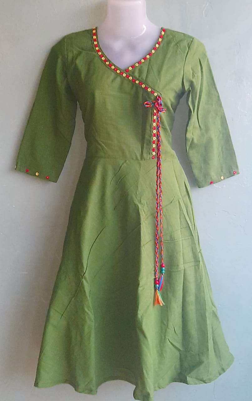 Bottle Green Angarkha Style Anarkali Cotton Kurti with Mirror Work.