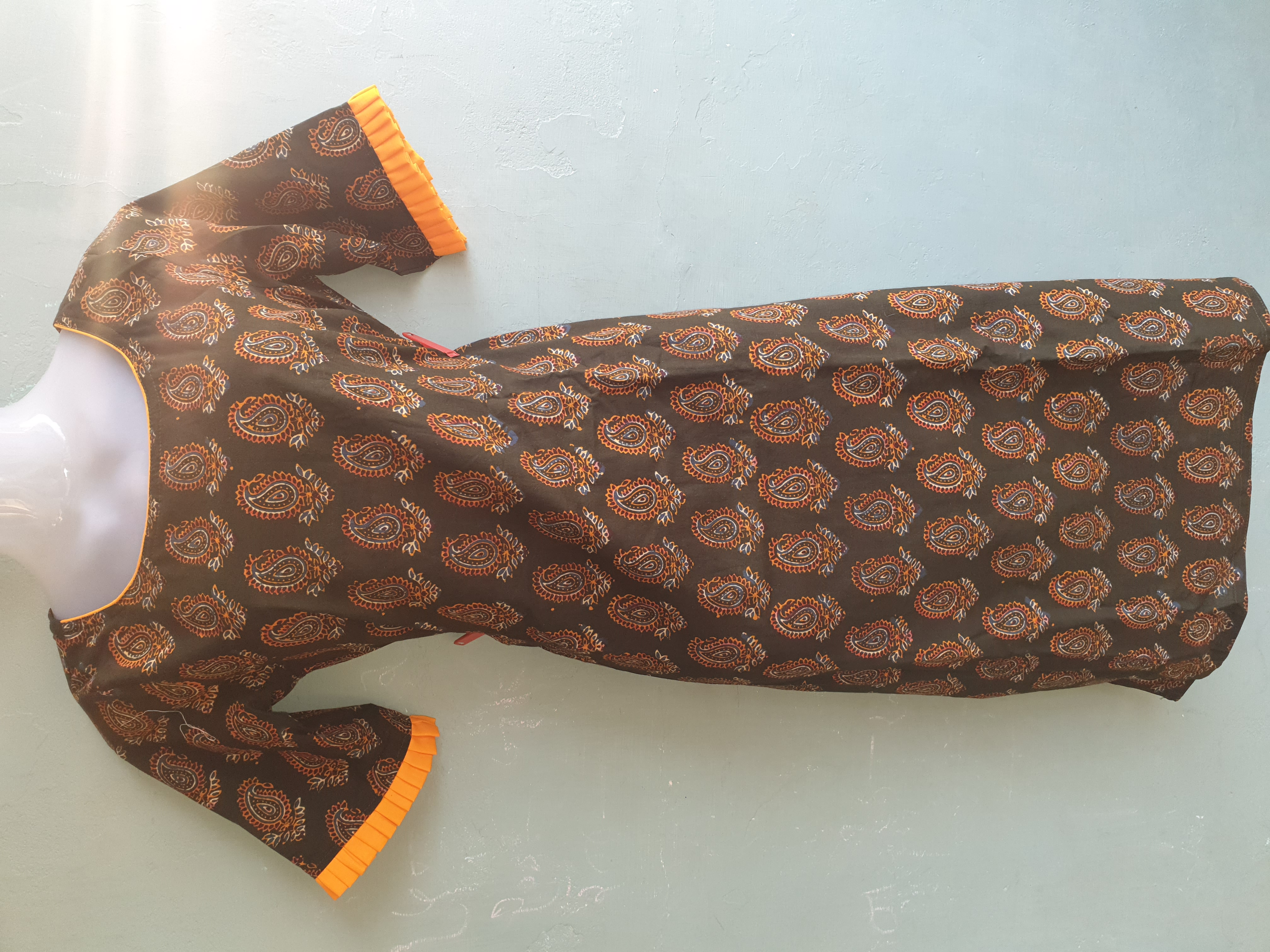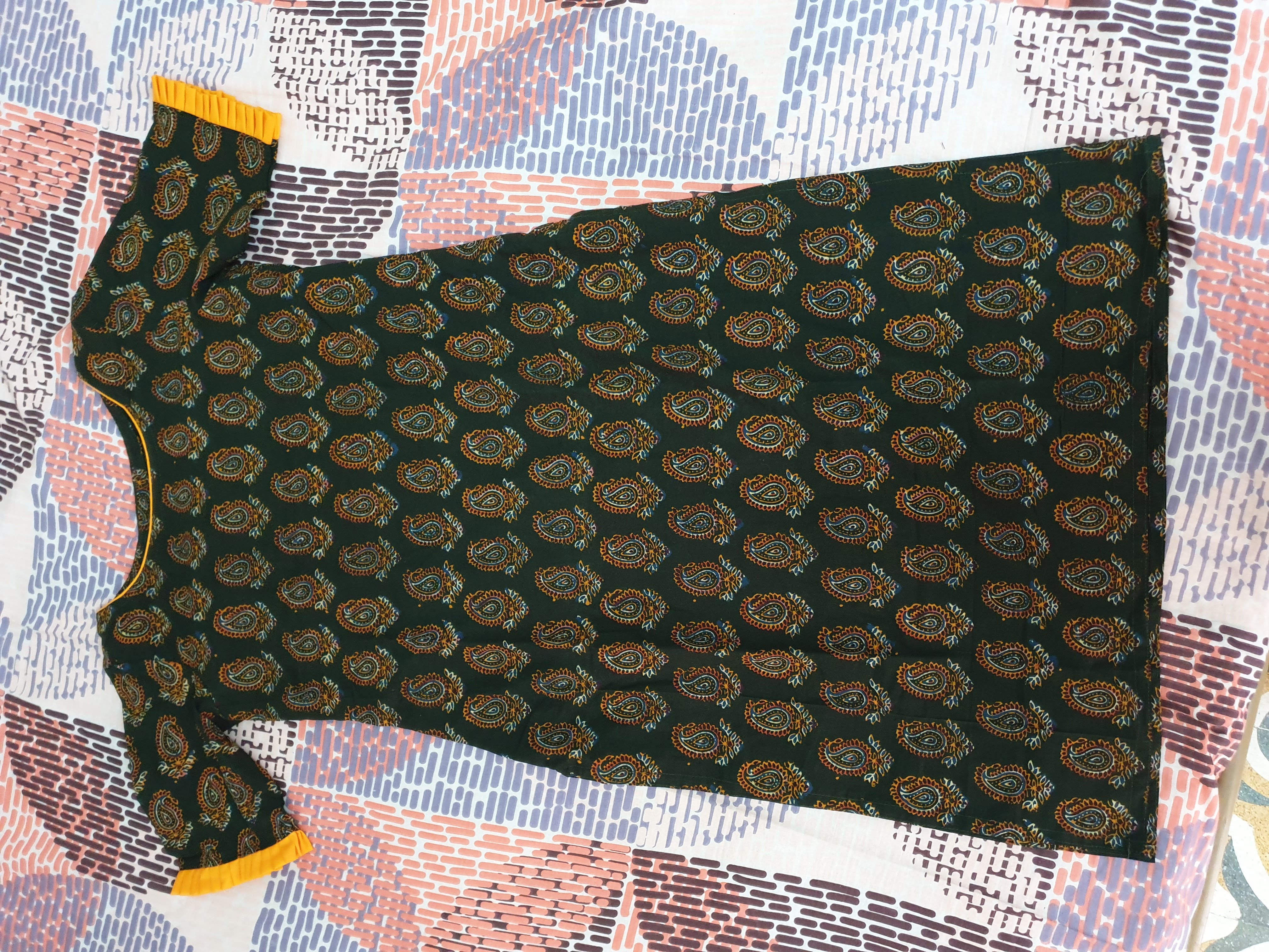 Bottle Green Cotton Straight Printed Kurti with Bottle Neck.